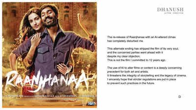 Superstar Dhanush has come down heavily against the unauthorised re-release of his 2013 romantic drama Raanjhanaa, with an altered AI-reimagined ending. The re-edited so-called “happy ending” version, has altered using artificial intelligence, was reportedly released without the creators’ knowledge or consent and sparked an industry-wide backlash.Following in director Anand L Rai’s lead, lead actor Dhanush took to his social media handles to express his disapproval about the use of AI. In a strongly worded note, he wrote, “The re-release of Raanjhanaa with an AI-altered climax has completely disturbed me. This alternate ending has stripped the film of its very soul, and the concerned parties went ahead with it despite my clear objection. This is not the film I committed to 12 years ago.“