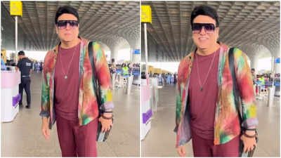 Recently, Govinda appeared at the airport in a cheerful mood. The actor greeted photographers warmly and posed happily before entering the terminal, showing no signs of distress over the speculation. Known for his lively and casual fashion sense, he maintained his signature style in his Saturday outfit. Govinda teamed a maroon tee with matching pants. He layered and broke the monotony with a printed rainbow hued shirt. Large sunnies, black shoes, a blue gemstone necklace and a backpack completed his cool airport look.