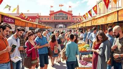 Diverse zodiac signs engage in characteristic shopping habits amidst a bustling, vibrant outdoor marketplace, filled with unique goods and lively interactions under bright daylight.